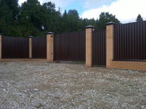 Заборы из профнастила с кирпичными столбами
